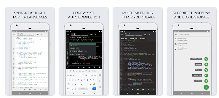 Code editor is an optimized text editor that focuses on coding. It is a handy tool for development on Android. It contains all the necessary features for coding, includes syntax highlighting, auto indention, code assist, auto completion, compilation and execution, etc.