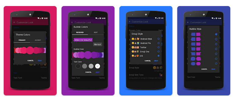 Feature rich, notably 180+ material design theme, bubble & app icon colors. Light, dark, black, night & android screen modes, multiple bubble styles, scheduled (future) SMS & MMS, send delay, slide to delete, slide to call, quick snap camera, multi-select picture gallery, quick reply SMS popup, awesome MMS GROUP messaging, quick voice memos, endless GIFs, 21 text sizes, multiple font options, message blocker / blocklisting, pin-to-top, automatic video & picture compression, support for iOS reactions, iOS emojis & heaps more!